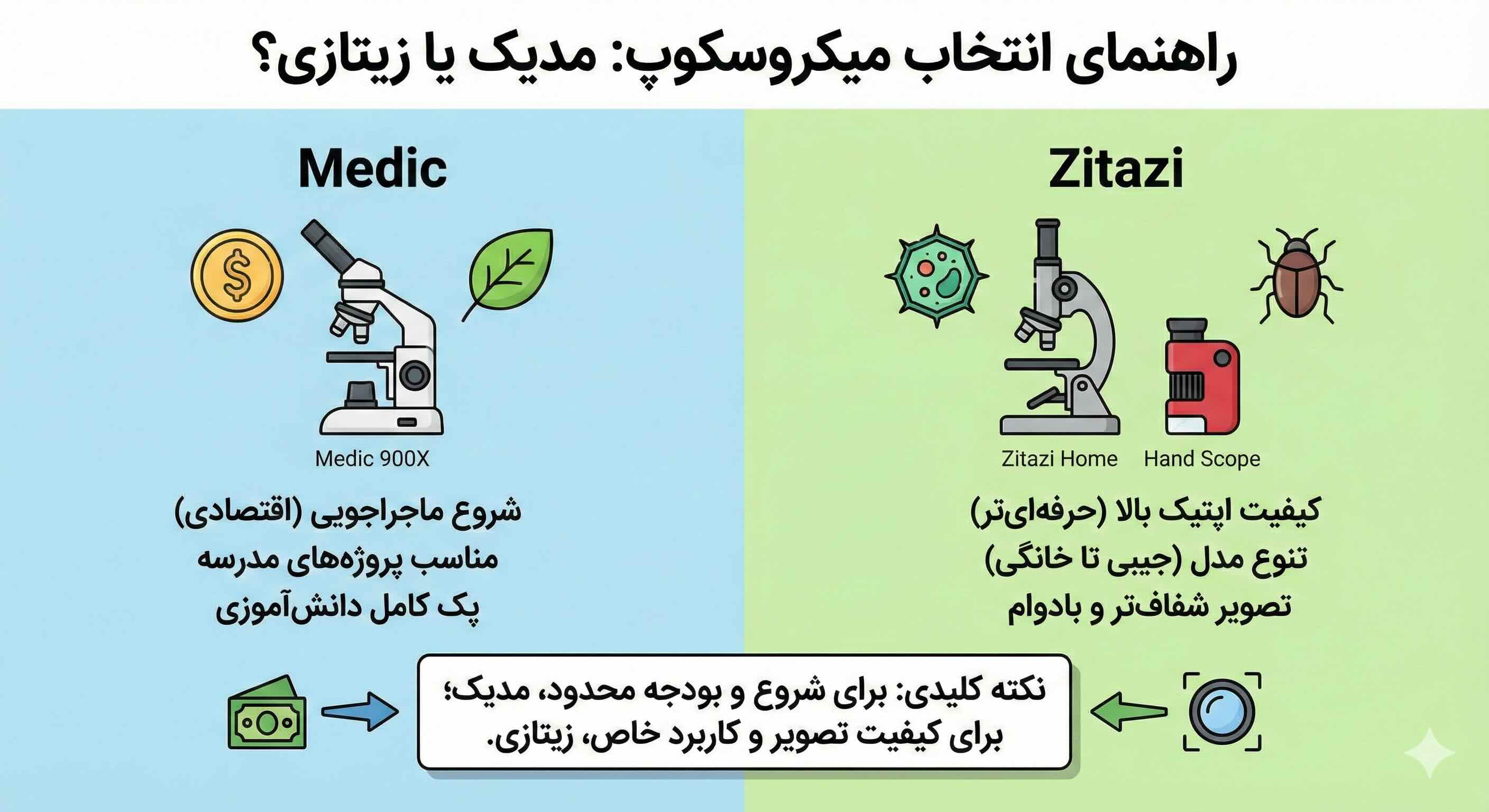 راهنمای خرید میکروسکوپ برای دانش آموزان و کاوشگران کوچک؛ مدیک (Medic) بخریم یا زیتازی (Zitazi)؟